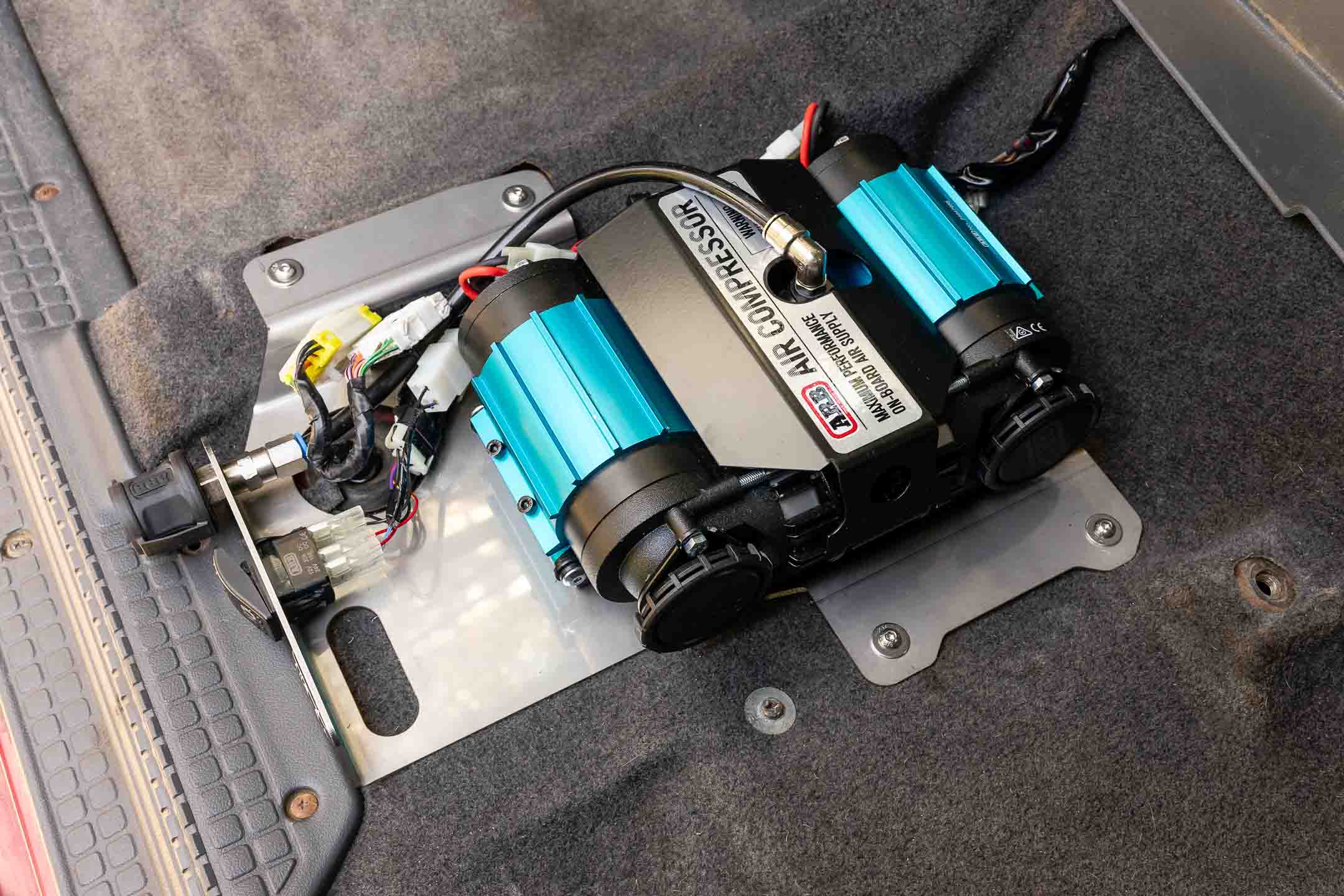 The ARB dual compressor is hard to beat!!! These units are very compact in size whilst offering one of the highest-flowing CFM's available on the market today! However, there's always a trade-off, they're also proven to be quite heavy, weighing in just shy of 9kg! By Installing the ARB unit paired with the AGOR compressor mount, not only does this maximise the unused space under the passenger seat, but it also keeps the weight of the compressor and your vehicle's center of gravity as low as possible.